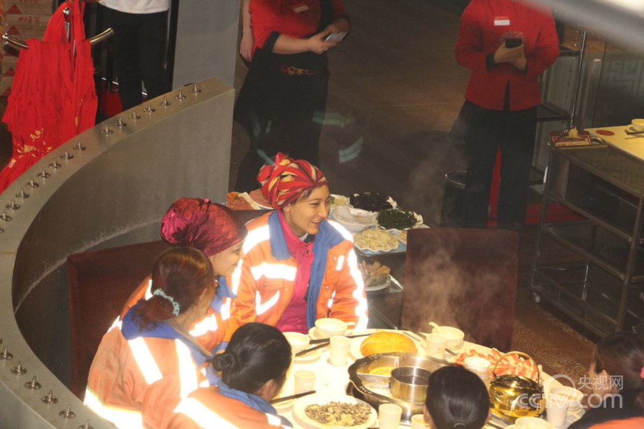 Sanitary workers dine together. (cntv.cn/Ma Xu)