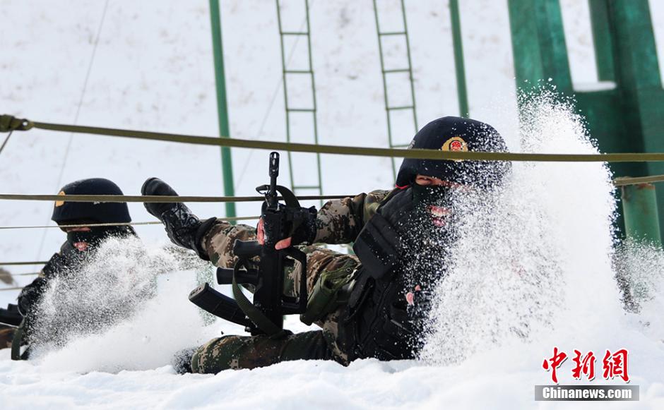 Female SWAT team members in Xinjiang train under harsh weather condition, Dec. 25, 2014. Members of this team are all with excellent physical qualities and educational backgrounds. After a long-term systematic training, they will undertake the mission of protecting the people and maintaining safety of the society. (Chinanews/Fan Xinyu)