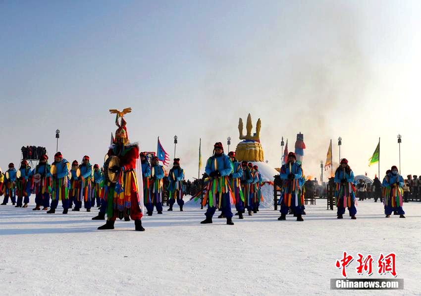 A ceremony of offering a sacrifice to the Lake God and waking up the fishing net is held at Chagan Lake in Songyuan city, northeast China's Jilin province, Dec. 28, 2014. Chagan Lake is the only area in China where traditional Mongolian ice fishing method is used. (CNS/ Zhang Yao)
