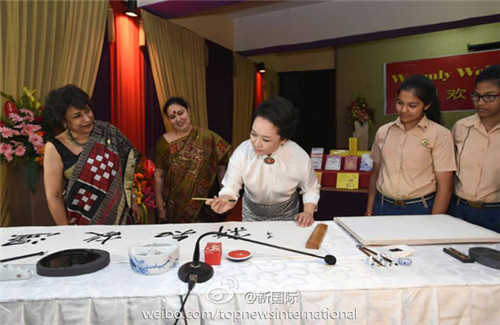 Peng Liyuan writes down a Chinese idiom using a writing brush during her visit to the Tagore International School in New Delhi, India, Sept. 18, 2014.(Photo/Xinhua)
