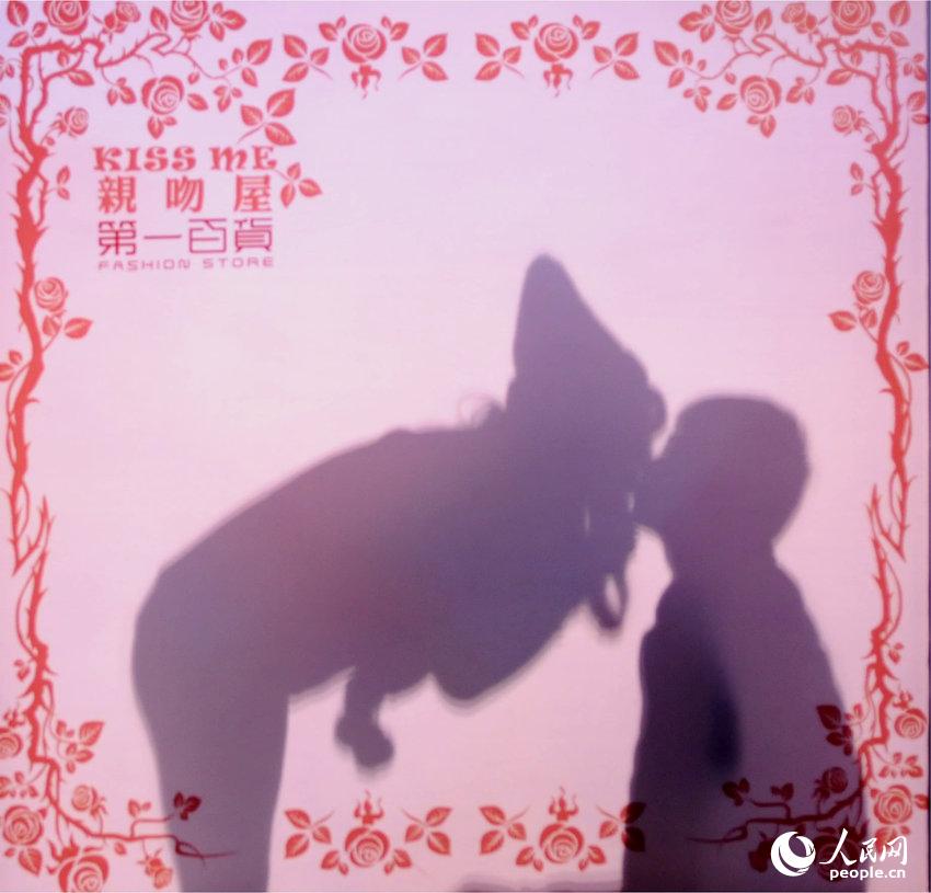 A "kissing room" opens to public for the first time in front of the No.1 Shopping Mall in Jinhua, Zhejiang province on Dec. 20, 2014. Lovers may kiss each other following the music in the room, with people enjoying their sketch outside at the same time. The activity aroused love in peoples’ heart.(Photo source: CFP) |