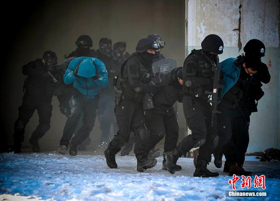 A SWAT team holds an anti-hijacking drill in Urumqi, northwest China’s Xinjiang Uygur Autonomous Region on Dec. 29, 2014. “Gangsters” hijacked several “hostages” with guns and knives and hid in a deserted factory. The SWAT members blitzed on “hijackers” and rescued the “hostages” rapidly. (Chinanews/Fang Tao) |