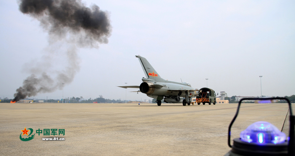 An air force station of Guangzhou military region holds an emergency drill on Dec. 24, 2014. The scenario was that the station was bombed in an air raid and many planes were on fire. Soldiers responded rapidly to defend the airport and resume the normal operation of the station. (Photo source: www.81.cn)