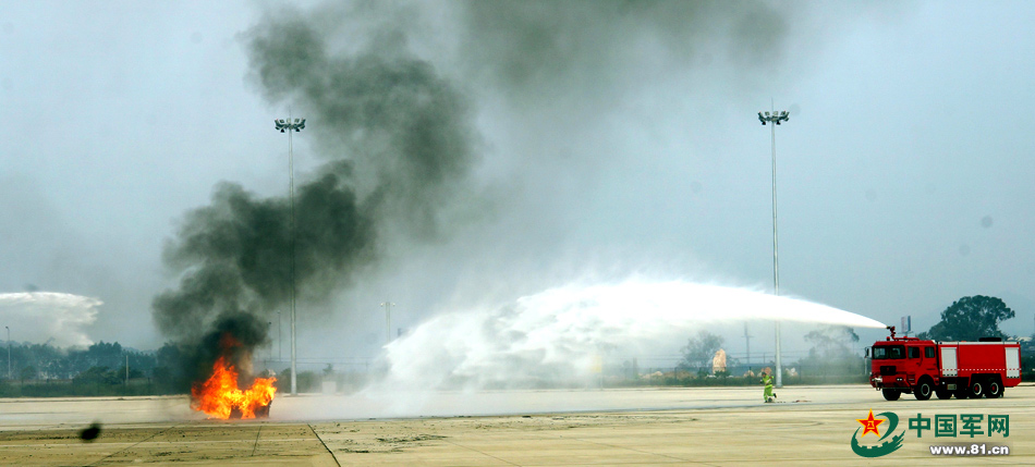 An air force station of Guangzhou military region holds an emergency drill on Dec. 24, 2014. The scenario was that the station was bombed in an air raid and many planes were on fire. Soldiers responded rapidly to defend the airport and resume the normal operation of the station. (Photo source: www.81.cn) |