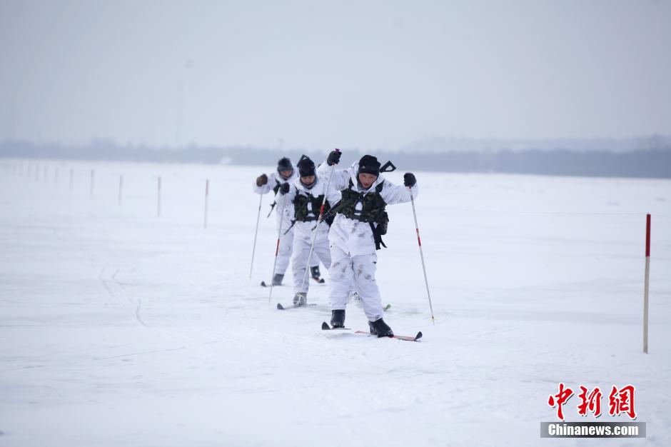 Soldiers of one frontier defense regiment in Heihe conduct skiing patrol under temperature of minus 25 degrees Celsius on Dec. 29, 2014. They also increased monitoring strength through various ways like video surveillance, mounted patrol and skiing patrol to secure border stability.(Chinanews/Wei Jianshun) |