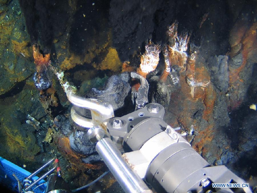 China's deep sea manned submersible Jiaolong collects samples on a hydrothermal vent in the Indian Ocean, Jan. 2, 2015. Jiaolong carried out the first dive on a mission to study active hydrothermal vent in the southwestern Indian Ocean on Jan. 2. It was the first time for the submersible to take the second batch of pilot trainees in the diving, which was intended to enable the trainees to learn some skills of submersible operation in active hydrothermal vent and collect samples of hydrothermal fluid, sulfide, rocks, sediment and water. (Xinhua/National Deep Sea Center)
