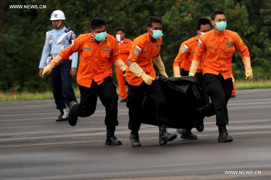 Indonesian search and rescue members carry debris from MH-60R Seahawk helicopters in Pangkalan Bun, Indonesia, Jan. 4, 2015. An Indonesian pilot taking part in the multinational search operation said here on Sunday that three more bodies were found in AirAsia crash site off Borneo coast. (Xinhua/Agung Kuncahya B.) |