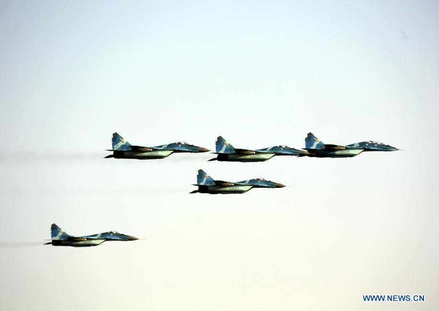 Myanmar military fighters participate in a ceremony to mark the 67th anniversary of Myanmar's Independence day in Nay Pyi Taw, Myanmar, Jan. 4, 2015. Myanmar resumed military parade and mass procession Sunday to celebrate the country's Independence Day for the first time in over five decades since the end of 1950s. (Xinhua/U Aung)