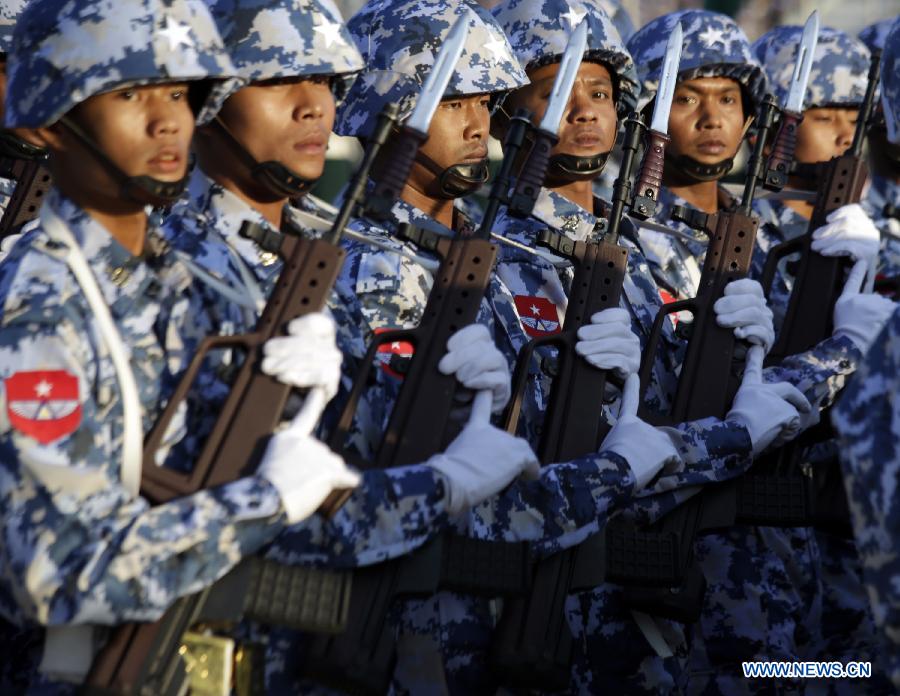 Myanmar soldiers participate in a ceremony to mark the 67th anniversary of Myanmar's Independence day in Nay Pyi Taw, Myanmar, Jan. 4, 2015. Myanmar resumed military parade and mass procession Sunday to celebrate the country's Independence Day for the first time in over five decades since the end of 1950s. (Xinhua/U Aung) |
