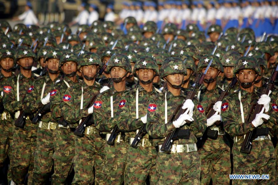 Myanmar soldiers participate in a ceremony to mark the 67th anniversary of Myanmar's Independence day in Nay Pyi Taw, Myanmar, Jan. 4, 2015. Myanmar resumed military parade and mass procession Sunday to celebrate the country's Independence Day for the first time in over five decades since the end of 1950s. (Xinhua/U Aung)