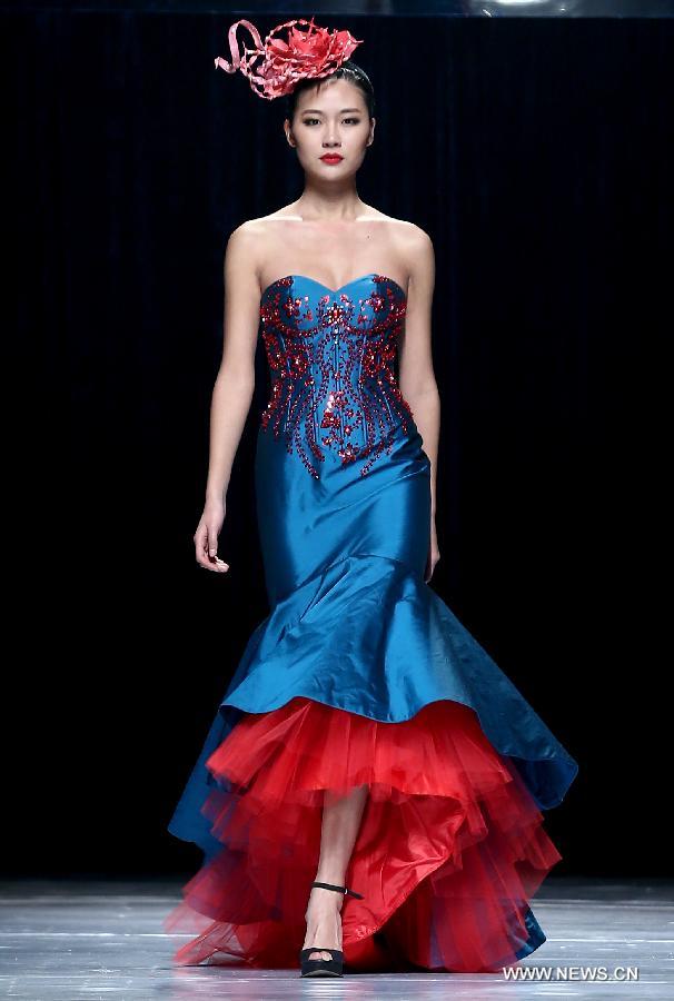 A model presents a creation by Malaysian designer Carven Ong at a wedding dress show during the China-ASEAN fashion week in Nanning, capital of southwest China's Guangxi Zhuang Autonomous Region, Jan. 3, 2015. (Xinhua/Chen Jianli)