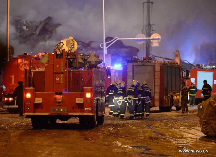 Firefighters have a discussion on extinguishing a fire broke out on a warehouse in Harbin, capital of northeast China's Heilongjiang Province, Jan. 3, 2015. The death toll of the fire has climbed to five as the bodies of two missing firefighters have been found, local authorities said on Saturday. The fire broke out at about 1 p.m. on Friday afternoon on the warehouse, which is part of an 11-storey residential building. In total, five firefighters were killed and another 13 firefighters and a security guard were injured in the accident. (Xinhua/Wang Kai) |
