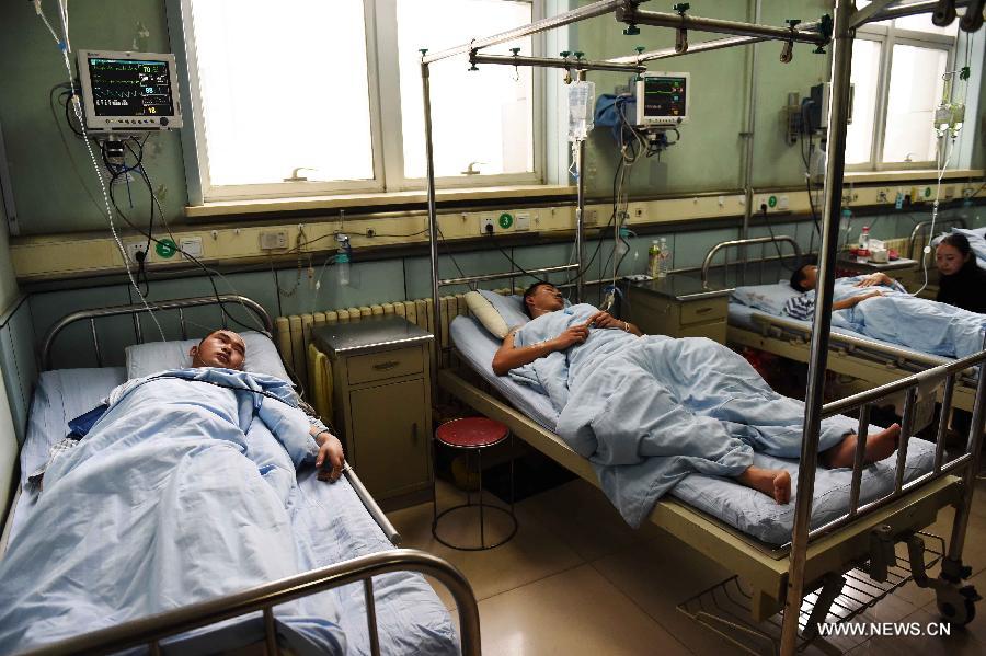 Firefighters injured in a warehouse blaze receive treatment at a hospital in Harbin, capital of northeast China's Heilongjiang Province, Jan. 3, 2015. A fire broke out at about 1 p.m. on Friday afternoon on the warehouse, which is part of an 11-story residential building. In total, five firefighters were killed and another 13 firefighters and a security guard were injured in the accident. (Xinhua/Wang Jianwei) |