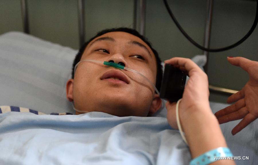 Firefighter Zhang Yu, who was injured in a warehouse blaze, answers phone calls of his friends at a hospital in Harbin, capital of northeast China's Heilongjiang Province, Jan. 3, 2015. A fire broke out at about 1 p.m. on Friday afternoon on the warehouse, which is part of an 11-story residential building. In total, five firefighters were killed and another 13 firefighters and a security guard were injured in the accident. (Xinhua/Wang Jianwei) |