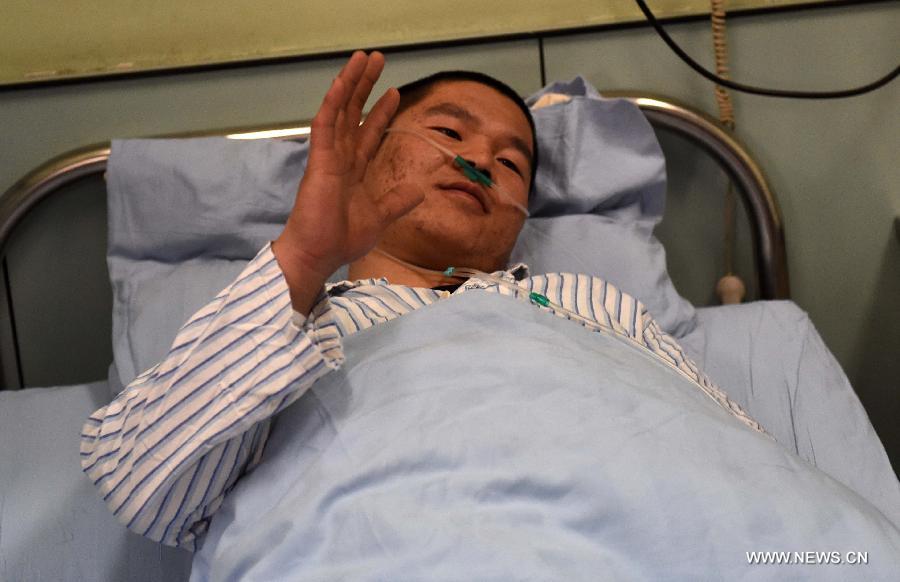 A firefighter injured in a warehouse blaze receives treatment at a hospital in Harbin, capital of northeast China's Heilongjiang Province, Jan. 3, 2015. A fire broke out at about 1 p.m. on Friday afternoon on the warehouse, which is part of an 11-story residential building. In total, five firefighters were killed and another 13 firefighters and a security guard were injured in the accident. (Xinhua/Wang Jianwei) |