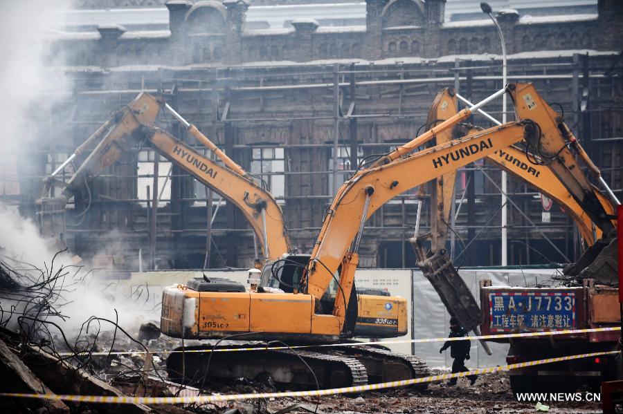 Heavy machinery clear the debris of a burnt warehouse at the Beifangnanxun ceramics market in Daowai District, Harbin, capital of northeast China's Heilongjiang Province, Jan. 4, 2014. The warehouse blaze in Harbin City that killed 5 firefighters still hasn't been completely extinguished, local firefighters said on Sunday. As of 10:40 a.m. Sunday, a residential building next to the warehouse was still smoldering. Rescuers said that the source of the fire has been hard to determine due to the building's complicated structure, and the building is at risk of collapsing. Firefighters are working from outside to extinguish the flames. (Xinhua/Wang Jianwei) |