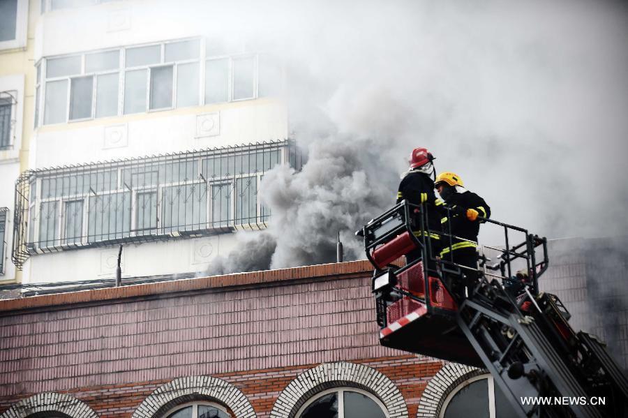 Smokes rise from a burnt warehouse at the Beifangnanxun ceramics market in Daowai District, Harbin, capital of northeast China's Heilongjiang Province, Jan. 4, 2014. The warehouse blaze in Harbin City that killed 5 firefighters still hasn't been completely extinguished, local firefighters said on Sunday. As of 10:40 a.m. Sunday, a residential building next to the warehouse was still smoldering. Rescuers said that the source of the fire has been hard to determine due to the building's complicated structure, and the building is at risk of collapsing. Firefighters are working from outside to extinguish the flames. (Xinhua/Wang Jianwei)