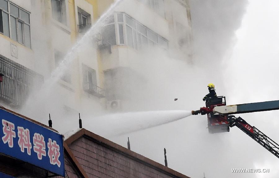 A firefighter sprays water to a burnt warehouse at the Beifangnanxun ceramics market in Daowai District, Harbin, capital of northeast China's Heilongjiang Province, Jan. 4, 2014. The warehouse blaze in Harbin City that killed 5 firefighters still hasn't been completely extinguished, local firefighters said on Sunday. As of 10:40 a.m. Sunday, a residential building next to the warehouse was still smoldering. Rescuers said that the source of the fire has been hard to determine due to the building's complicated structure, and the building is at risk of collapsing. Firefighters are working from outside to extinguish the flames. (Xinhua/Wang Jianwei) |