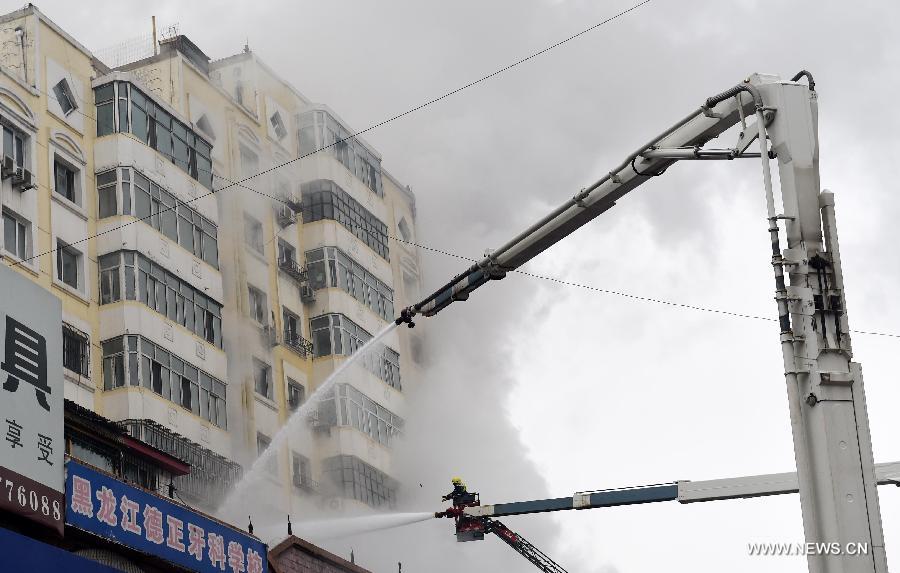 Firefighters spray water to a burnt warehouse at the Beifangnanxun ceramics market in Daowai District, Harbin, capital of northeast China's Heilongjiang Province, Jan. 4, 2014. The warehouse blaze in Harbin City that killed 5 firefighters still hasn't been completely extinguished, local firefighters said on Sunday. As of 10:40 a.m. Sunday, a residential building next to the warehouse was still smoldering. Rescuers said that the source of the fire has been hard to determine due to the building's complicated structure, and the building is at risk of collapsing. Firefighters are working from outside to extinguish the flames. (Xinhua/Wang Jianwei) |