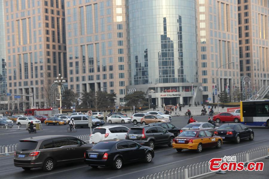 A general view of heavy traffic on a trunk road in Beijing during morning peak hours on the first workday, Jan 4, 2015. This workday after three-day New Year holiday happens to be Sunday when no private cars in Beijing are banned from the road under the current vehicle restriction rule. [Photo: China News Service/Liu Xianguo] |