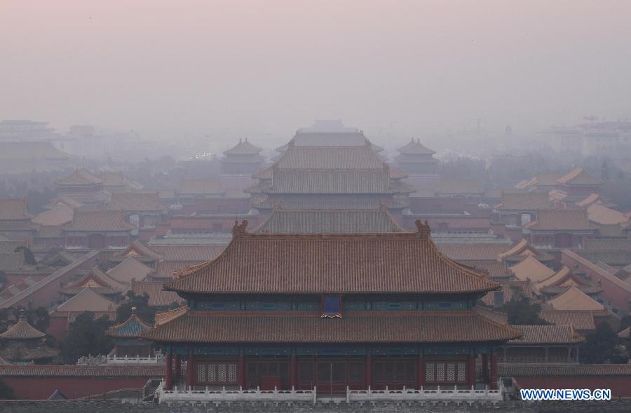 The Palace Museum, or the Forbidden City, is shrouded in smog in Beijing, capital of China, Jan. 4, 2015. China's top meteorological authority forecast medium to severe smog in the country's northern regions including Beijing and Tianjin as well as the neighboring Hebei Province on Sunday. Meanwhile, smoggy weather will also affect the country's eastern province of Jiangsu as well as the southwestern province of Sichuan on Sunday. (Xinhua/Liu Xianguo) |