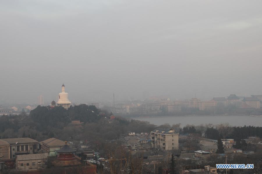 The Beihai Park is shrouded in smog in Beijing, capital of China, Jan. 4, 2015. China's top meteorological authority forecast medium to severe smog in the country's northern regions including Beijing and Tianjin as well as the neighboring Hebei Province on Sunday. Meanwhile, smoggy weather will also affect the country's eastern province of Jiangsu as well as the southwestern province of Sichuan on Sunday. (Xinhua/Liu Xianguo) |