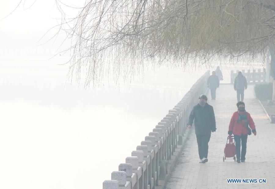 People walk in smog in Lianyungang City, east China's Jiangsu Province, Jan. 4, 2015. China's top meteorological authority forecast medium to severe smog in the country's northern regions including Beijing and Tianjin as well as the neighboring Hebei Province on Sunday. Meanwhile, smoggy weather will also affect the country's eastern province of Jiangsu as well as the southwestern province of Sichuan on Sunday. (Xinhua/Geng Yuhe) |