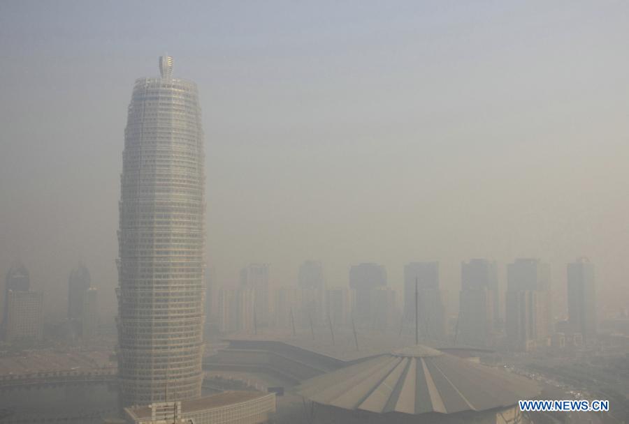 Buildings are shrouded in smog in Zhengzhou, capital of central China's Henan Province, Jan. 4, 2015. China's top meteorological authority forecast medium to severe smog in the country's northern regions including Beijing and Tianjin as well as the neighboring Hebei Province on Sunday. Meanwhile, smoggy weather will also affect the country's eastern province of Jiangsu as well as the southwestern province of Sichuan on Sunday. (Xinhua/Feng Lei) |
