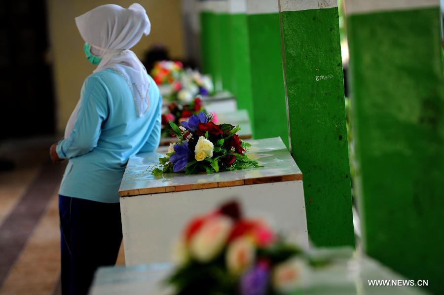 A woman stands near a coffin of victim of AirAsia Flight QZ8501 at a hospital in Pangkalan Bun, Indonesia. Jan. 4, 2015. An Indonesian pilot taking part in the multinational search operation said here on Sunday that three more bodies were found in AirAsia crash site off Borneo coast. (Xinhua/Agung Kuncahya B.)