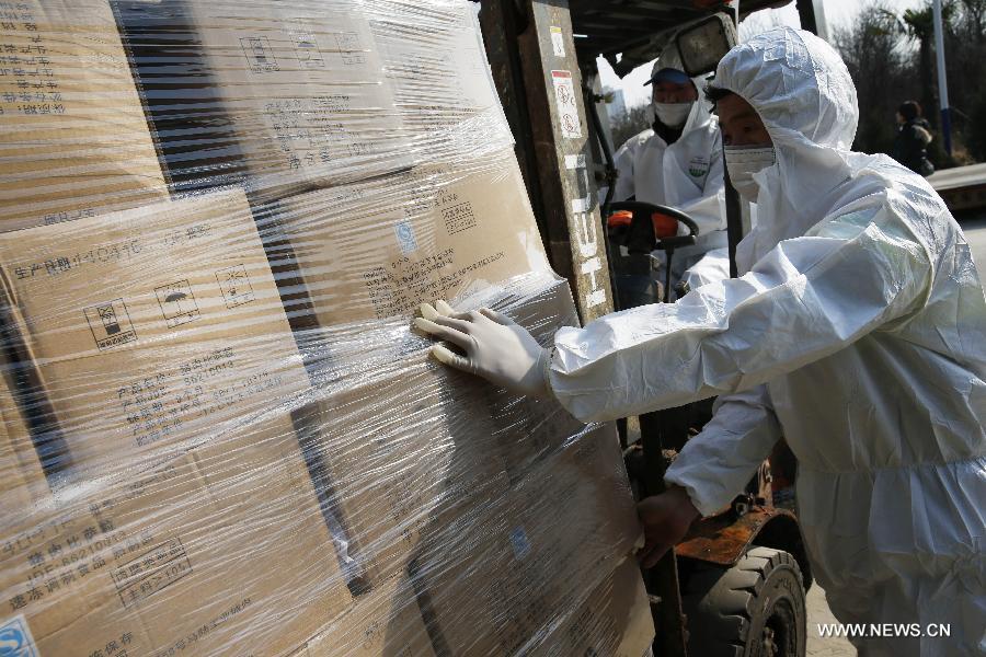 Workers of an innocuous treatment center take Husi's unqualified food to dispose in Shanghai, east China, Jan. 4, 2015. A total of 521.21 tons of unqualified food Husi recalled were safely disposed after the last 1415 boxes were disposed on Sunday. Shanghai Husi Food Co., Ltd, a meat supplier for mainly McDonald and KFC, was investigated in July of 2014 for supplying stale meat to McDonald and KFC outlets. (Xinhua/Pei Xin) |