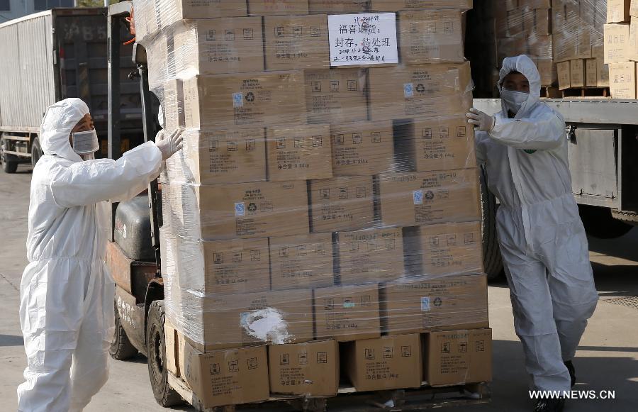 Workers of an innocuous treatment center take Husi's unqualified food to dispose in Shanghai, east China, Jan. 4, 2015. A total of 521.21 tons of unqualified food Husi recalled were safely disposed after the last 1415 boxes were disposed on Sunday. Shanghai Husi Food Co., Ltd, a meat supplier for mainly McDonald and KFC, was investigated in July of 2014 for supplying stale meat to McDonald and KFC outlets. (Xinhua/Pei Xin) |