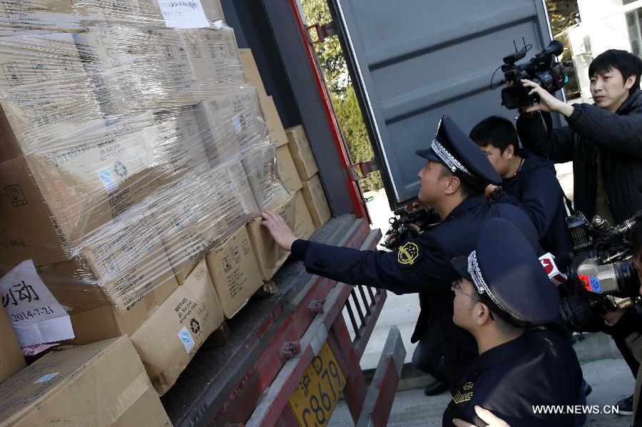 Staff members of Shanghai food and drug administration check Husi's unqualified food before the innocuous treatment in Shanghai, east China, Jan. 4, 2015. A total of 521.21 tons of unqualified food Husi recalled were safely disposed after the last 1415 boxes were disposed on Sunday. Shanghai Husi Food Co., Ltd, a meat supplier for mainly McDonald and KFC, was investigated in July of 2014 for supplying stale meat to McDonald and KFC outlets. (Xinhua/Pei Xin) |