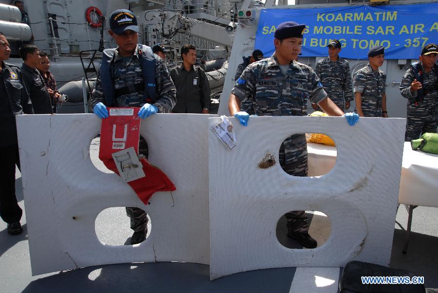 Indonesian Navy crew members of ship KRI Bung Tomo show the media the debris of AirAsia flight QZ8501 recovered in search operations at a naval base in Surabaya, Indonesia, Jan. 5, 2015. (Xinhua/ Syaiful Arif)