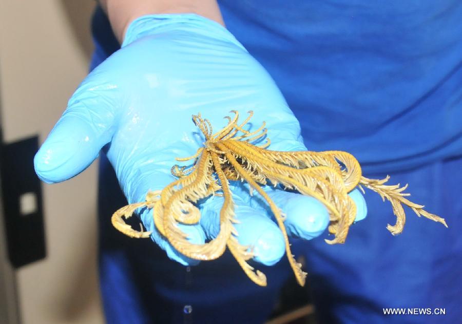 Photo taken on Jan. 4, 2015 shows a piece of coral collected by China's deep sea manned submersible Jiaolong from seabed of a hydrothermal vent in the southwestern Indian Ocean. Jiaolong on Saturday collected a perfect "chimney vent" with several mussels and spiral shells living on it. (Xinhua/Zhang Xudong)