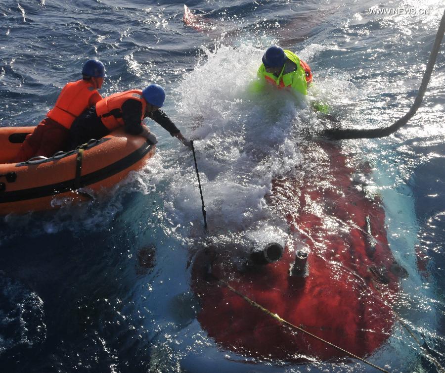 Working staff try to tie the rope on China's manned submersible Jiaolong in the seabed of southwestern Indian Ocean, Jan. 4, 2015. Jiaolong, named after a mythical dragon, is on a 120-day expedition in the southwest Indian Ocean. It has planned to conduct 20 dives during the four-month period to research polymetallic sulfide, biological diversity, hydrothermal microbes and genetic resources in the area. (Xinhua/Zhang Xudong) |