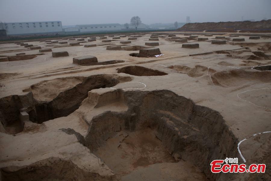 A general view of an archaeological site in Zhengzhou, Central China’s Henan province, Jan 5, 2015. Archaeologists have unearthed a “middle city” at the site, which has a large area composed of 40 sacrificial pits in good order. Archaeologists also found building foundations of a palace in early Shang Dynasty (1600 BC to 1046 BC), covering an area of 3,000 square meters. Henan is an important location of the Shang and Zhou dynasties with a lot of historical relics. [Photo: China News Service/Wang Zhongju]