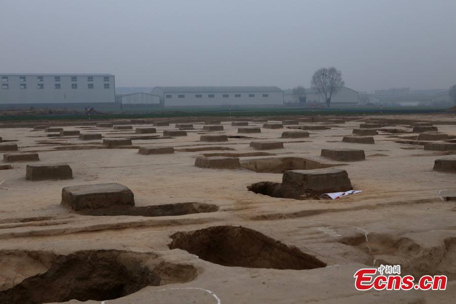 A general view of an archaeological site in Zhengzhou, Central China’s Henan province, Jan 5, 2015. Archaeologists have unearthed a “middle city” at the site, which has a large area composed of 40 sacrificial pits in good order. Archaeologists also found building foundations of a palace in early Shang Dynasty (1600 BC to 1046 BC), covering an area of 3,000 square meters. Henan is an important location of the Shang and Zhou dynasties with a lot of historical relics. [Photo: China News Service/Wang Zhongju]