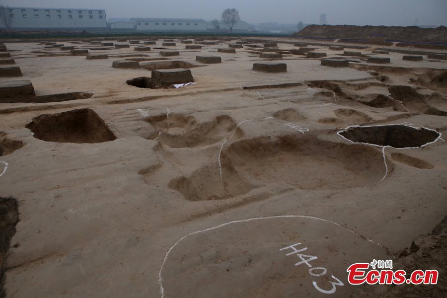 A general view of an archaeological site in Zhengzhou, Central China’s Henan province, Jan 5, 2015. Archaeologists have unearthed a “middle city” at the site, which has a large area composed of 40 sacrificial pits in good order. Archaeologists also found building foundations of a palace in early Shang Dynasty (1600 BC to 1046 BC), covering an area of 3,000 square meters. Henan is an important location of the Shang and Zhou dynasties with a lot of historical relics. [Photo: China News Service/Wang Zhongju] |