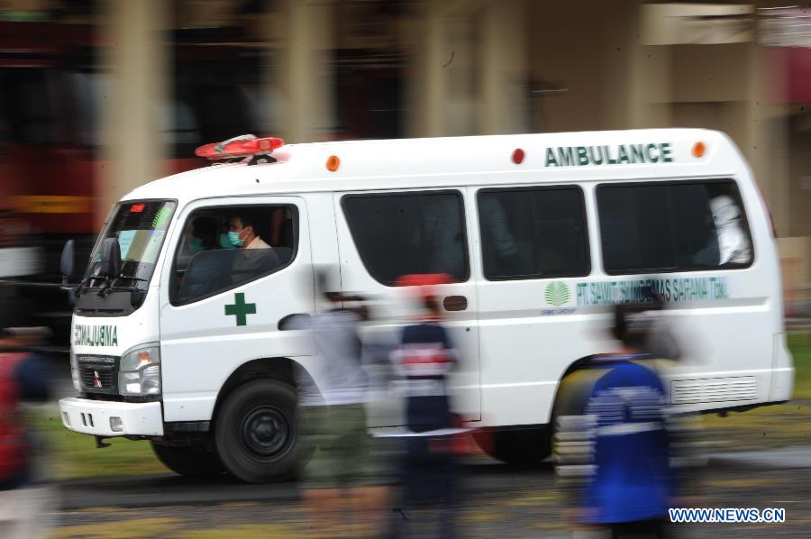 An ambulance carries the victim of AirAsia flight QZ8501 at Iskandar Air Force Base, Pangkalan Bun, Central Kalimantan, Indonesia, Jan. 5, 2015. (Xinhua/Veri Sanovri)