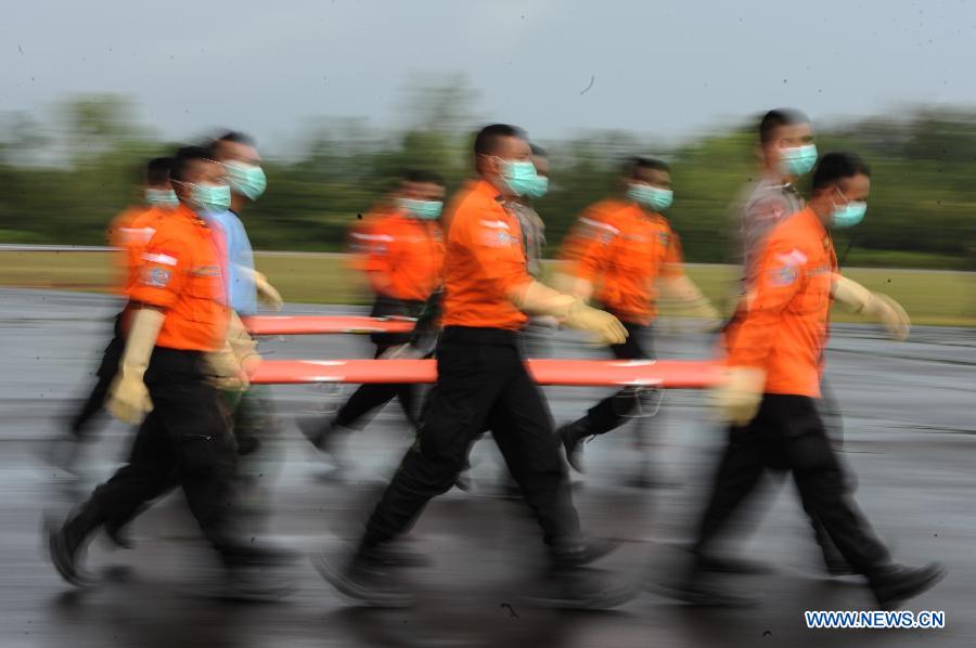 Members of SAR, police and TNI crews walk to carry the body bag that contains victim of AirAsia flight QZ8501 at Iskandar Air Force Base, Pangkalan Bun, Central Kalimantan, Indonesia, Jan. 5, 2015. (Xinhua/Veri Sanovri)