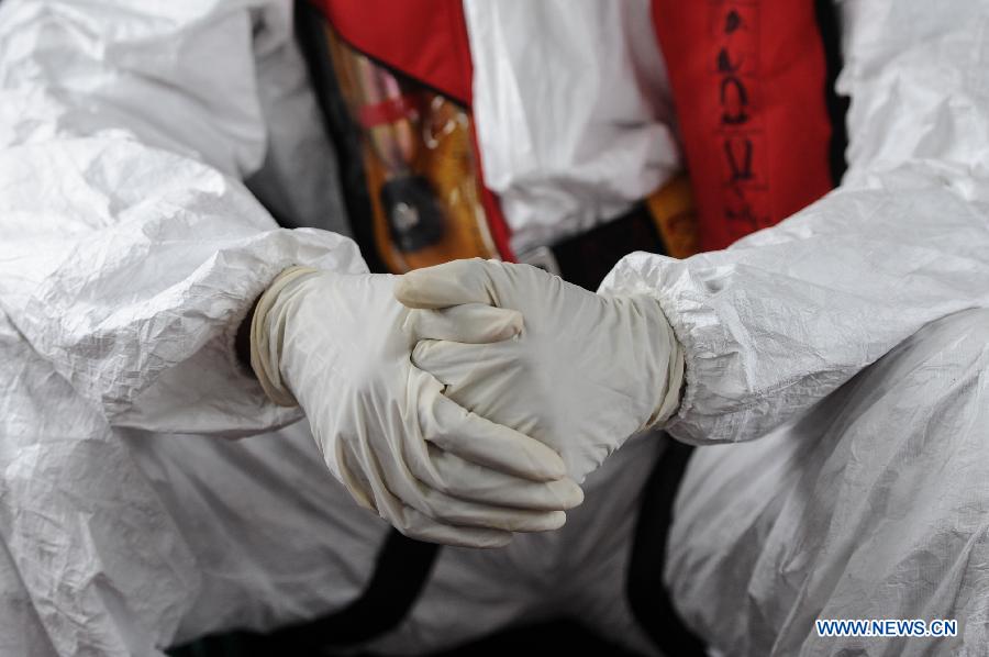 A member of Search and Rescue team wearing gloves and safety jacket sits in a helicopter during the searching of debris and victims of AirAsia flight QZ8501 at Karimata strait, Indonesia, Jan. 6, 2015. The search operation for AirAsia Flight QZ8501 will spread slightly eastward on Tuesday as the weather and currents drag wreckage in that direction, the head of Indonesia's rescue agency said. (Xinhua/Veri Sanovri) |