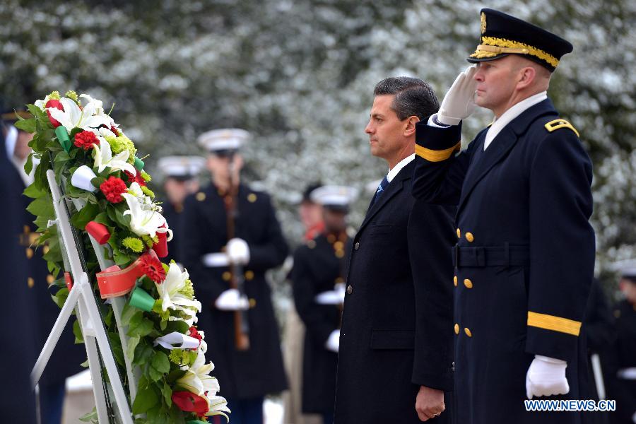 Image provided by Mexico's Presidency shows Mexican President Enrique Pena Nieto (2nd R) presenting a wreath to the Tomb of the Unknown Soldier at the Arlington National Cementery in Washington D.C. Jan. 6, 2015. Enrique Pena Nieto started a two-day official visit to the U.S. on Jan. 5. (Xinhua/Mexico's Presidency)