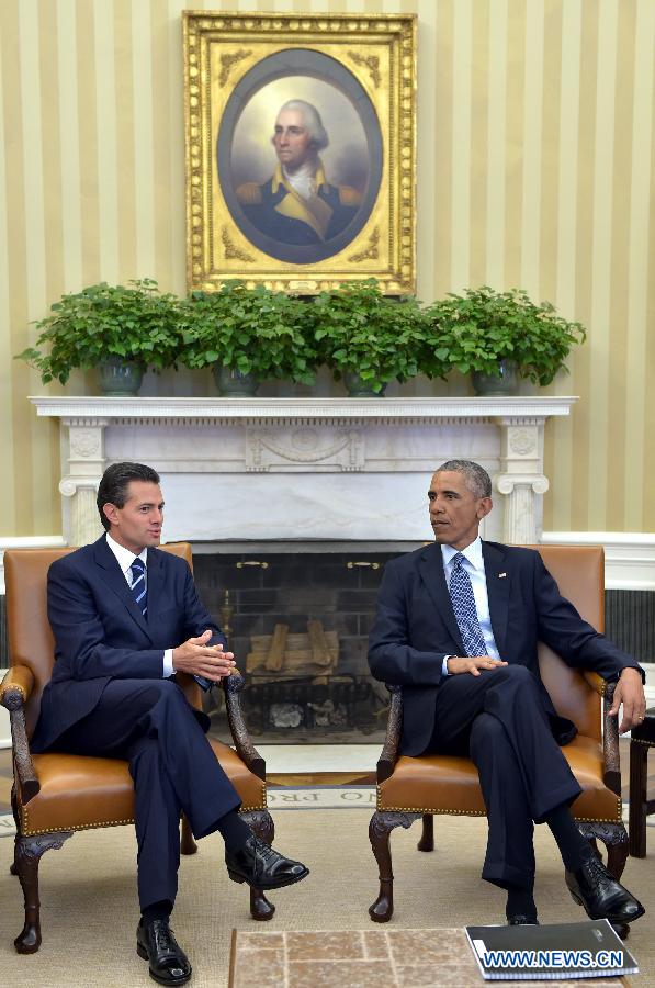 Image provided by Mexico's Presidency shows Mexican President Enrique Pena Nieto (L) meeting with his U.S. counterpart Barack Obama at the White House in Washington D.C. Jan. 6, 2015. Enrique Pena Nieto started a two-day official visit to the U.S. on Jan. 5. (Xinhua/Mexico's Presidency)