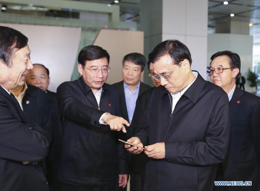 Chinese Premier Li Keqiang (R front) visits Huawei in Shenzhen, south China's Guangdong Province, Jan. 4, 2015. Li made an inspection tour in Shenzhen and Guangzhou from Jan. 4 to 6.(Xinhua/Ding Lin)