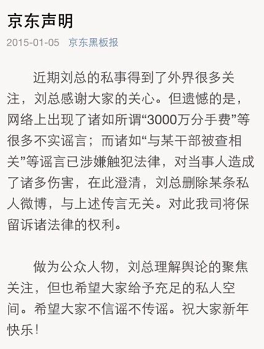 Jingdong releases a statement online over the break-up fee, Monday, January 5, 2015. [Photo: Jingdong]