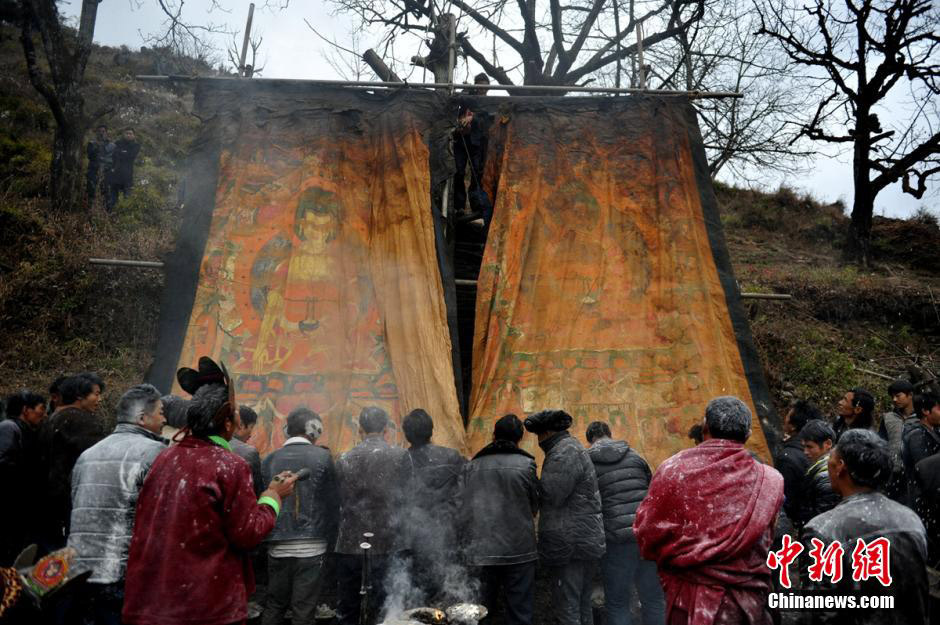 The two Thangka paintings are carefully put on the shelves. (Chinanews/Liu Zhongjun)