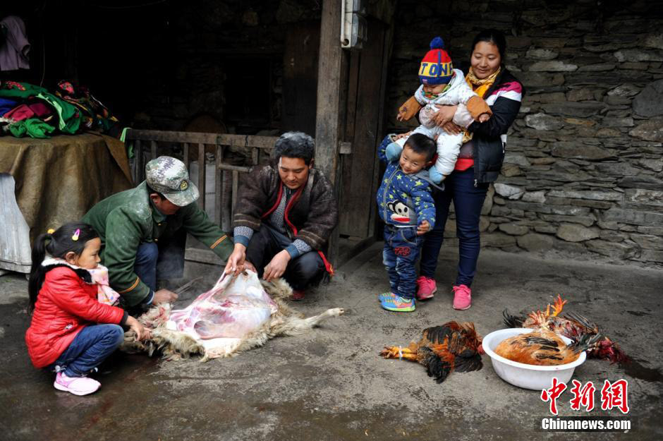 Villagers prepare chicken and mutton for guests. (Chinanews/Liu Zhongjun)