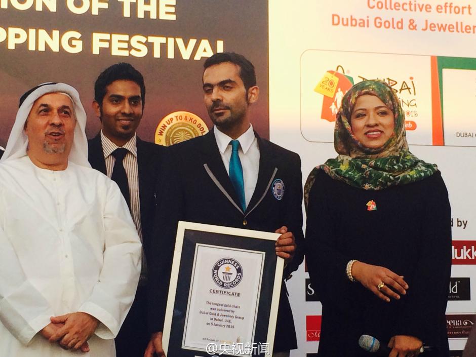 A 5,522-meter long handmade golden chain is displayed in the Golden Street in Dubai on Jan. 5. 2014, which has set a new Guinness World Record. After the exposition, it will be cut into bracelets and necklaces for sale. The buyer can have a certificate for its origin. (Photo/Weibo of CNTV)