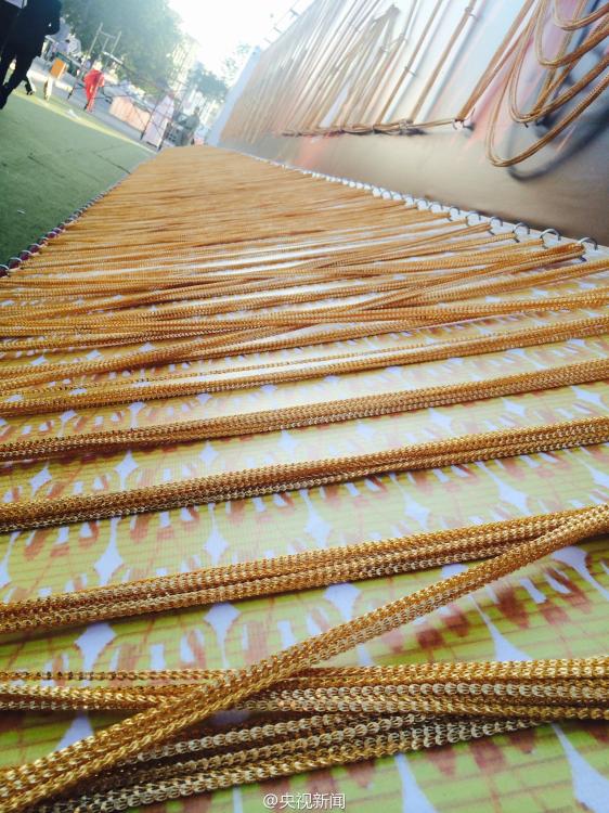 A 5,522-meter long handmade golden chain is displayed in the Golden Street in Dubai on Jan. 5. 2014, which has set a new Guinness World Record. After the exposition, it will be cut into bracelets and necklaces for sale. The buyer can have a certificate for its origin. (Photo/Weibo of CNTV)