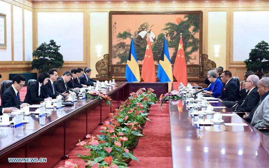 Chinese Premier Li Keqiang meets with Bahamian Prime Minister Perry Christie, who is here to attend the First Ministerial Meeting of the Forum of China and the Community of Latin American and Caribbean States (CELAC), in Beijing, capital of China, Jan. 8, 2015. (Xinhua/Li Tao)